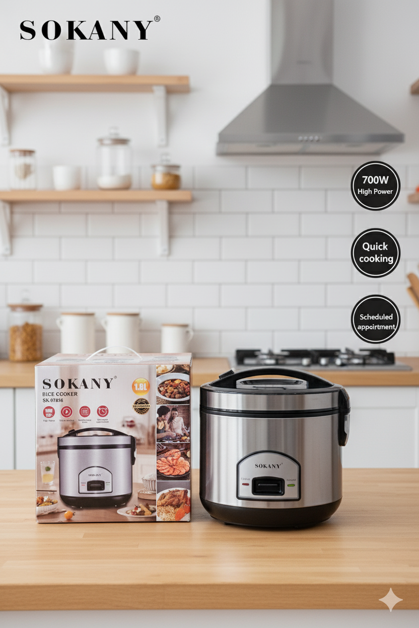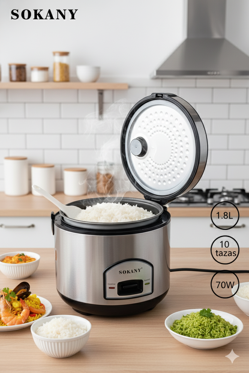 La Sokany SK-07056 es una arrocera compacta y eficiente, perfecta para preparar arroz suave y uniforme sin esfuerzo. Con 700 W de potencia y una capacidad de 1.8 litros (10 tazas), es ideal para hogares pequeños, oficinas o uso diario.