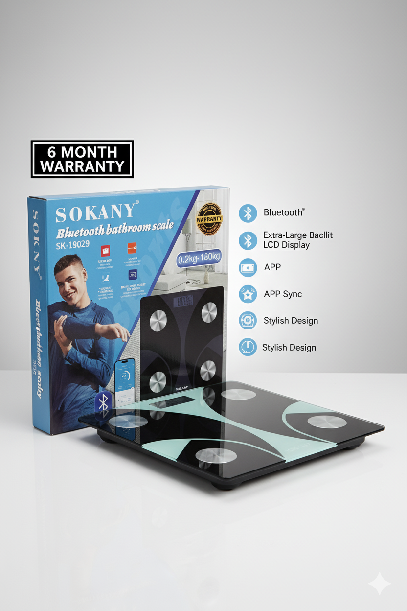 La Sokany SK-19029 es una báscula inteligente diseñada para ofrecerte un control preciso y moderno de tu peso. Puede medir desde 200 g hasta 180 kg, brindando resultados confiables para todo tipo de usuarios. Su tecnología avanzada incluye un aplicativo con conexión Bluetooth, ideal para sincronizar datos con tu teléfono y llevar un seguimiento completo desde tu celular.