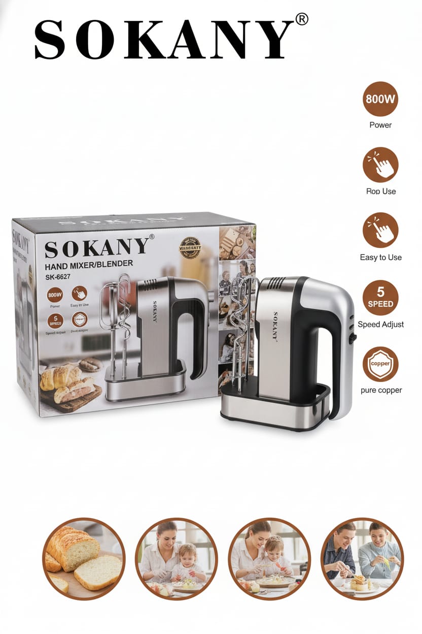 La Sokany SK-6627 combina un diseño elegante y moderno con un rendimiento superior para facilitar todo tipo de preparaciones en la cocina. Con 800 W de potencia, 5 velocidades ajustables y un botón Turbo, ofrece la fuerza necesaria para batir, mezclar y amasar de manera eficiente y sin esfuerzo.