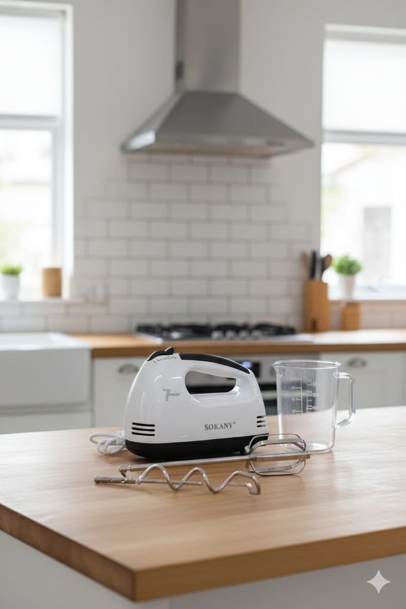Batidora SK-133, silenciosa, con 180 W, 7 velocidades y ganchos de acero inoxidable. Compacta, práctica y perfecta para uso diario en repostería y cocina.