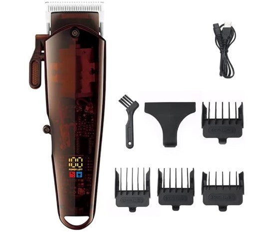 Funciones: cuchilla de acero inoxidable con afilado automático, pantalla LED con indicador de batería, motor potente de bajo ruido, incluye 4 peines guía, cable de carga USB, aceite lubricante y cepillo de limpieza