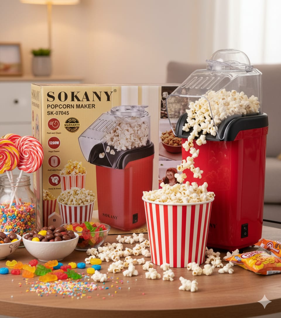 La Sokany SK-07045 es la máquina ideal para preparar palomitas frescas en casa de manera rápida y saludable. Con 1200 W de potencia, convierte los granos en palomitas en solo segundos, sin aceite y con una cocción uniforme.